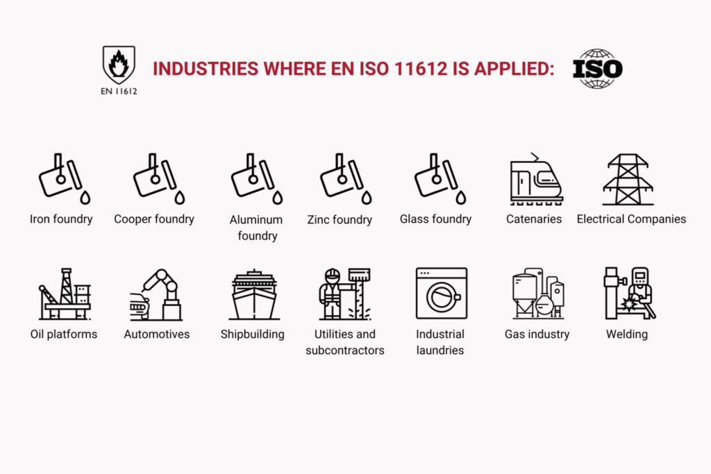 EN ISO 11612 es una norma europea que establece los requisitos de protección para la ropa utilizada para proteger al usuario contra el calor y las llamas. La norma se aplica a la ropa de protección para trabajadores expuestos a riesgos térmicos, como llamas, calor convectivo, calor radiante, contacto con metal fundido y proyecciones de partículas incandescentes.