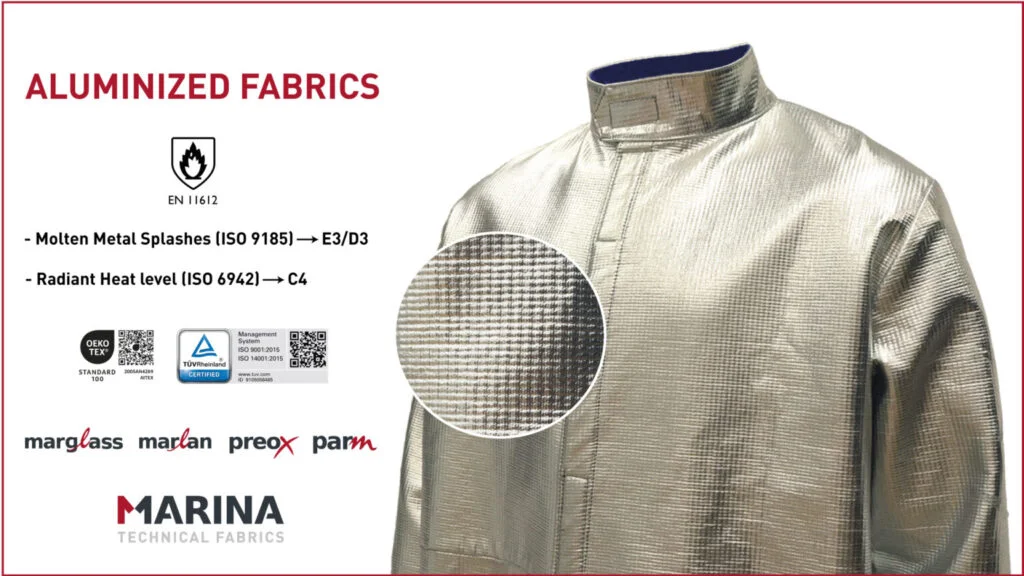 Este tipo de tejido está diseñado a partir de nuestro artículo sobre Marlan. Al aluminizar este tejido de lana, viscosa o poliamida, conseguimos que, además de ofrecer protección contra metales fundidos, también ofrezca protección contra el calor radiante. Nuestros tejidos cuentan con el máximo nivel de protección contra el calor radiante según la norma ISO 6942.
